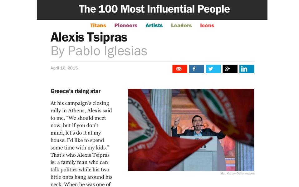 Στους «ηγέτες», εκτός από τον Αλέξη Τσίπρα, περιλαμβάνονται ο πρόεδρος των ΗΠΑ Μπαράκ Ομπάμα, η Γερμανίδα καγκελάριος Άνγκελα Μέρκελ, ο πρόεδρος της Κούβας Ραούλ Κάστρο, ο Μπενιαμίν Νετανιάχου, η Χίλαρι Κλίντον, ο Βλαντίμιρ Πούτιν, η πρέσβειρα των Ηνωμένων Πολιτειών στον ΟΗΕ Σαμάνθα Πάουερ, ο ιρακινός πρωθυπουργός Χάιντερ αλ-Αμπάντι, ο Τζεμπ Μπους, ο Κιμ Γιονγκ-Ουν, ηγέτης της Βόρειας Κορέας και η Μαρί Λεπέν, η οποία μάλιστα είχε περιληφθεί και στον κατάλογο του 2011.
